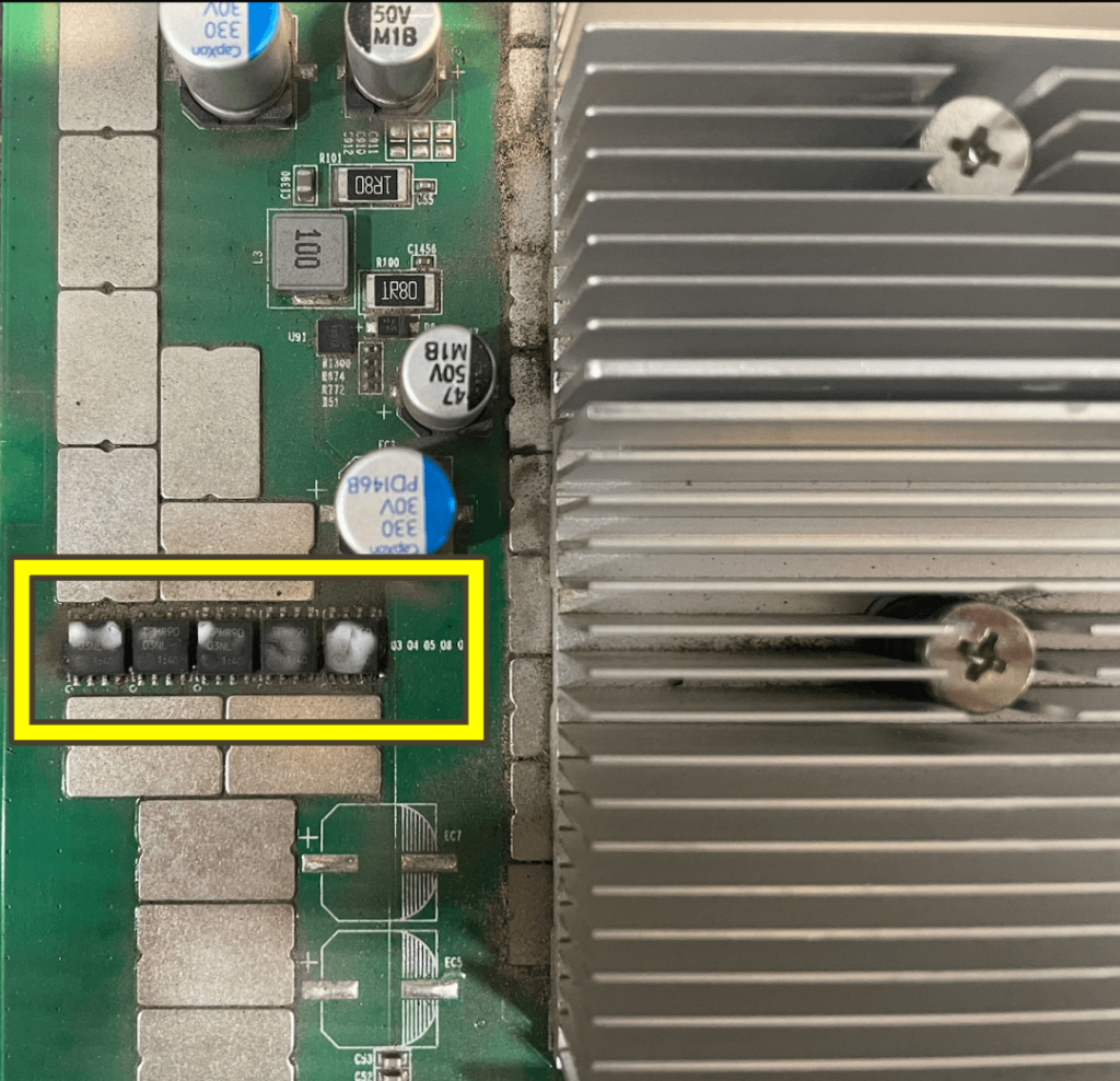 It is interesting to note the design evolution of Bitmain hardware. While older S19 series models utilized these MOSFET chips on their hashboards as power switches, Bitmain largely phased them out in newer model designs.